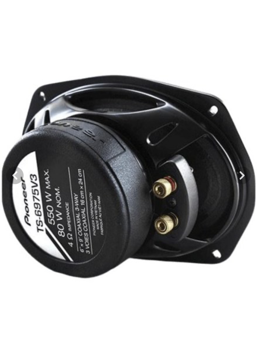 بلندگو کواکسیال پایونیر مدل Ts۶۹۷۵v3 ابعاد: 6″ × 9″ (یا حدوداً 16 × 24 سانتیمتر) — قالب oval. حداکثر قدرت (MAX): 550 وات. قدرت نامی (RMS): 80 وات. امپدانس: 4 اهم. حساسیت: 92 dB (1W/1m). پاسخ فرکانسی: از حدود 28 Hz تا 27 kHz. عمق نصب (mounting depth): حدود 92 mm. اندازه برش (cut-out): تقریباً 151 mm × 220 mm برای نصب این مدل. مواد و ساختار: مخروط (cone) از کاغذ غیر فشرده شده (non-pressed paper) برای وزن کم و سختی بالا. پی surround از اورتان با دو لایه (dual-layer urethane surround) برای کاهش رزونانس ناخواسته. پیویفی (PI / Polyimide) فیلمی برای مخروط میانه (midrange) که تمرکز بر وضوح صدای وکال داره. ترمینالهای پیچدار طلایی (gold-plated screw terminal) برای اتصال بهتر.